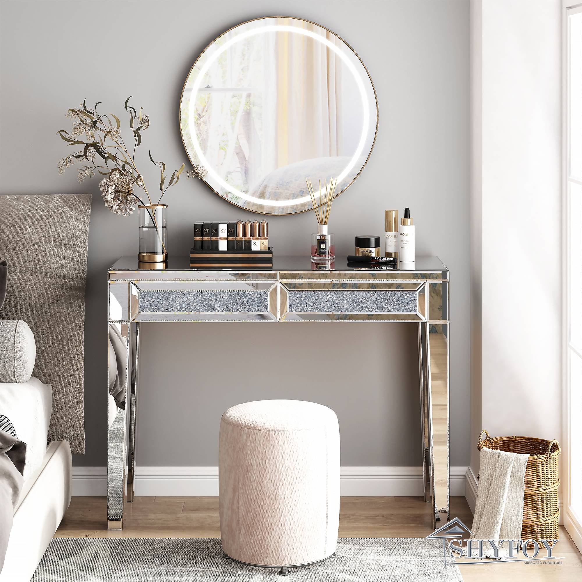 SHYFOY Mirrored Vanity Dresser with Drawers for Bedroom, Silver Make Up Table Inlay with Crushed Crystals