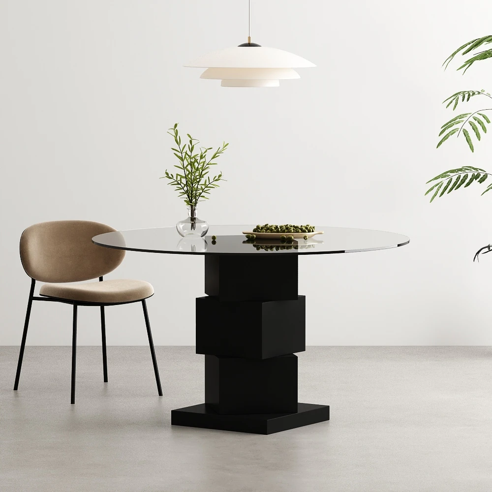 Modern Round Glass Dining Table with Sculptural Wood Base