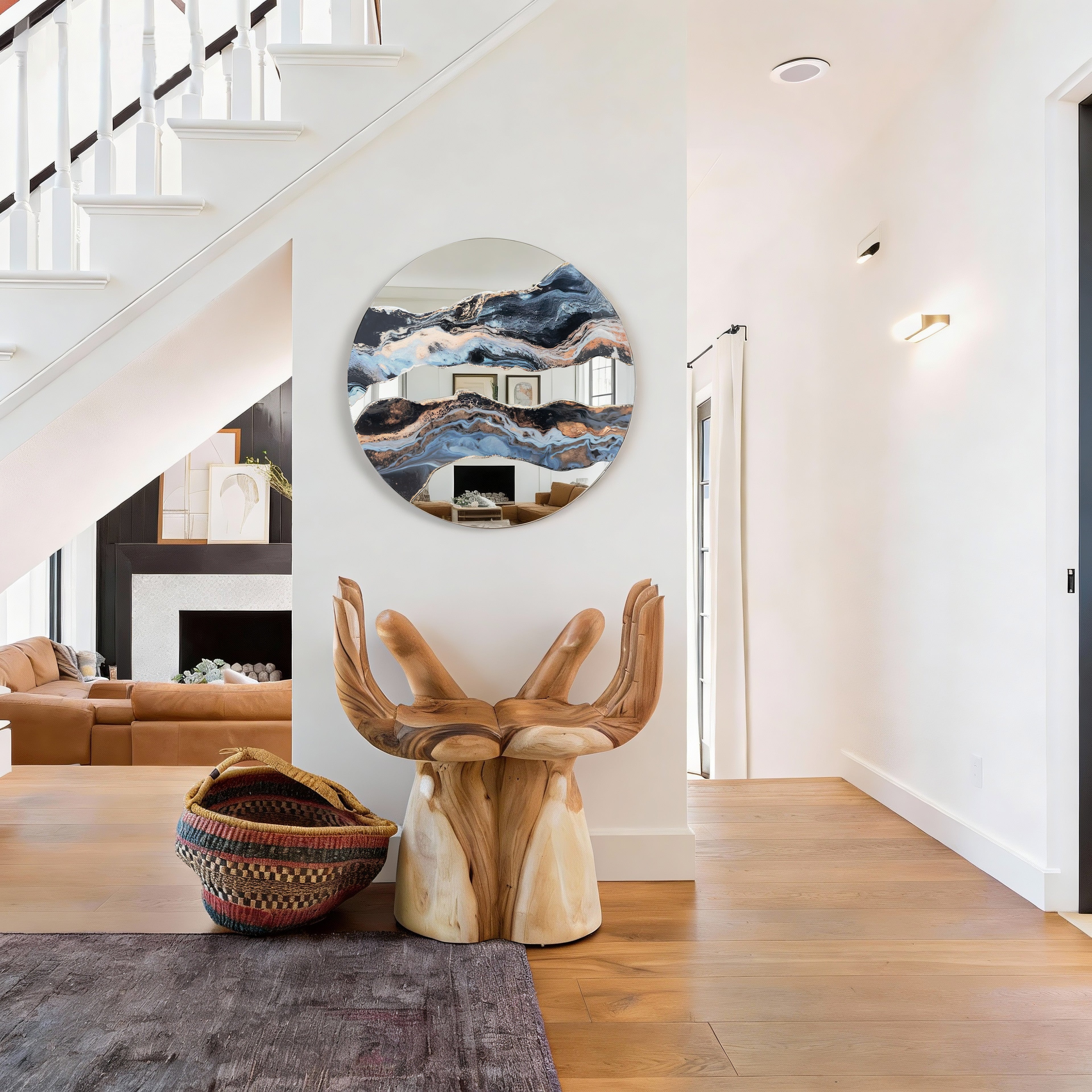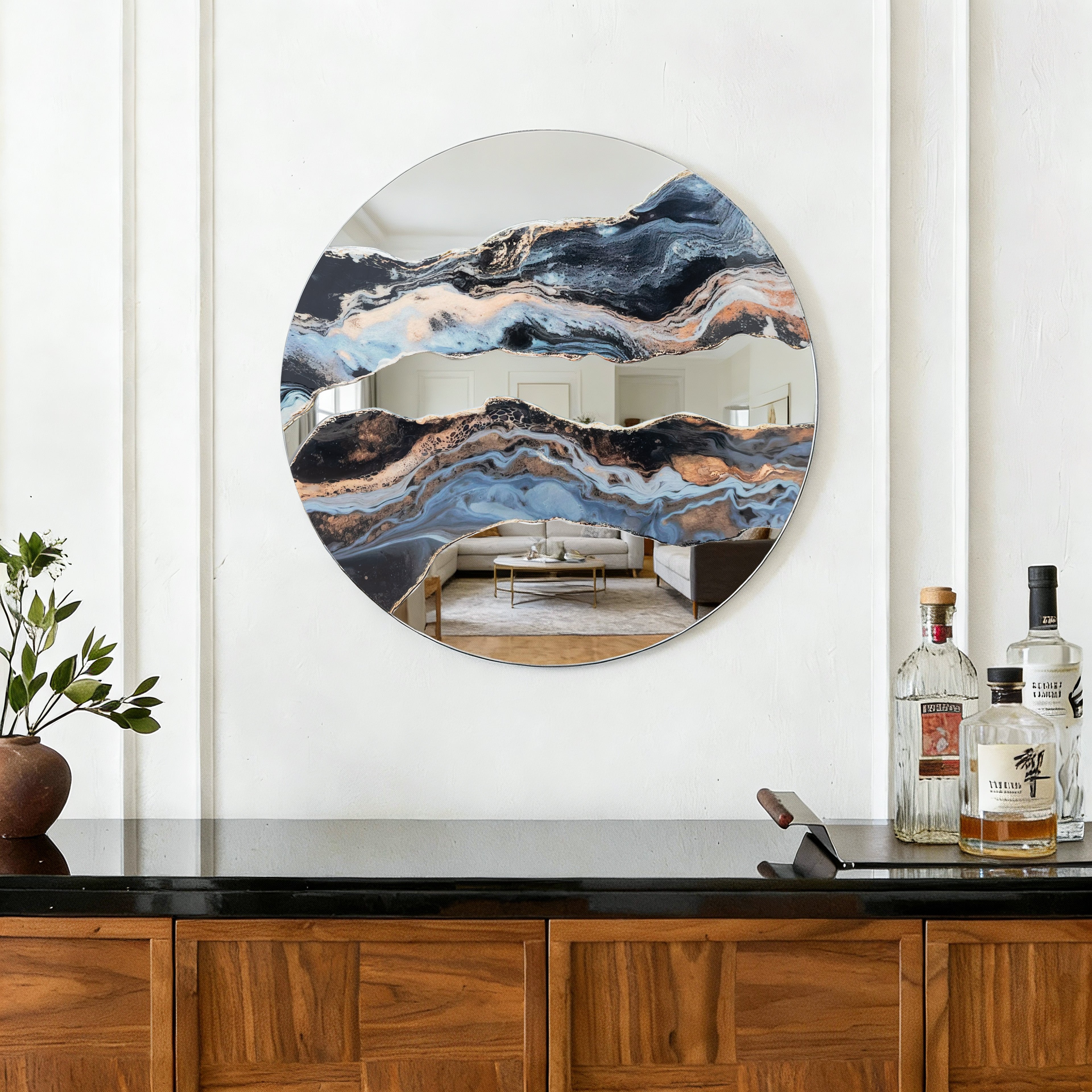 Elevate your space with this statement round wall mirror—where artistry meets function. Featuring a mesmerizing resin-marbled design (charcoal, soft blue, warm gold swirls), it blends modern elegance as a gallery-worthy accent. Crafted with premium distortion-free glass for crisp reflections, its sleek circular silhouette complements contemporary, transitional, and minimalist decor. Perfect for living rooms, bedrooms, entryways, or offices, it adds sophisticated, one-of-a-kind charm to any focal wall or compact nook.