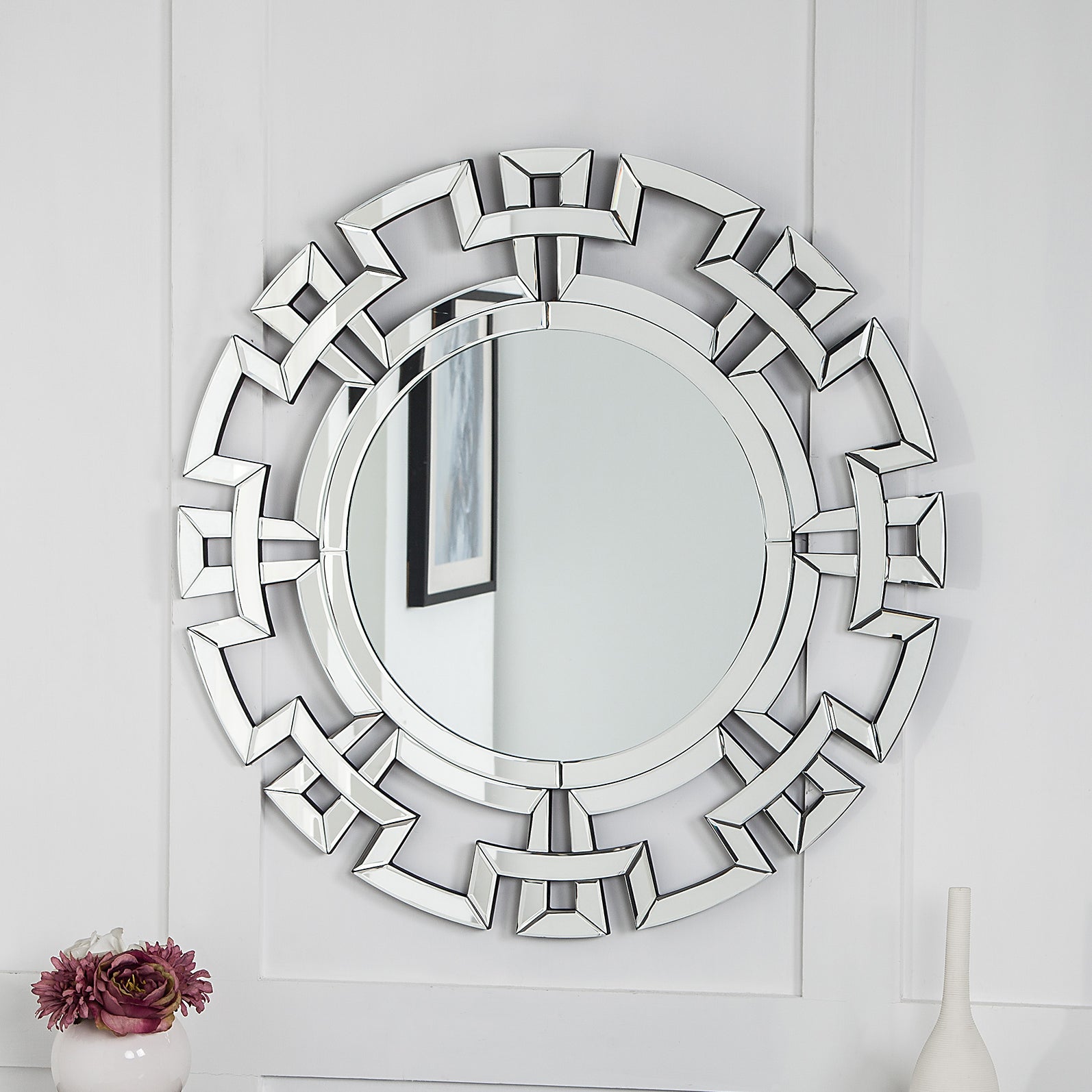 SHYFOY Large Geometric Accent Mirror, Modern Openwork Design, Round Mirror Silver Edge for Sitting room, Hallway