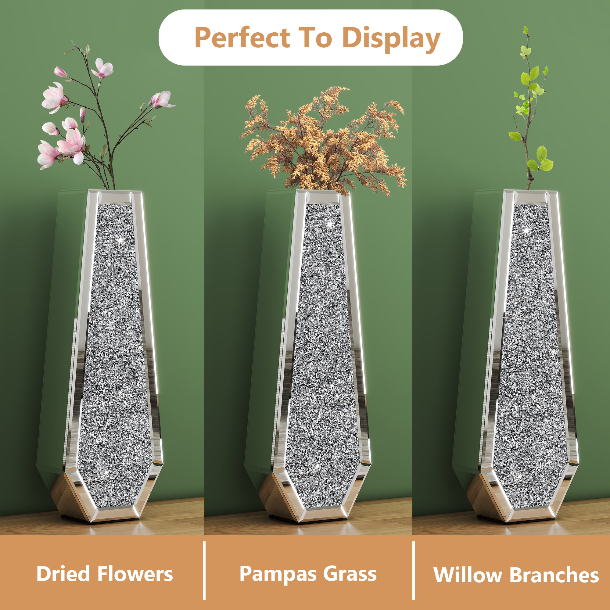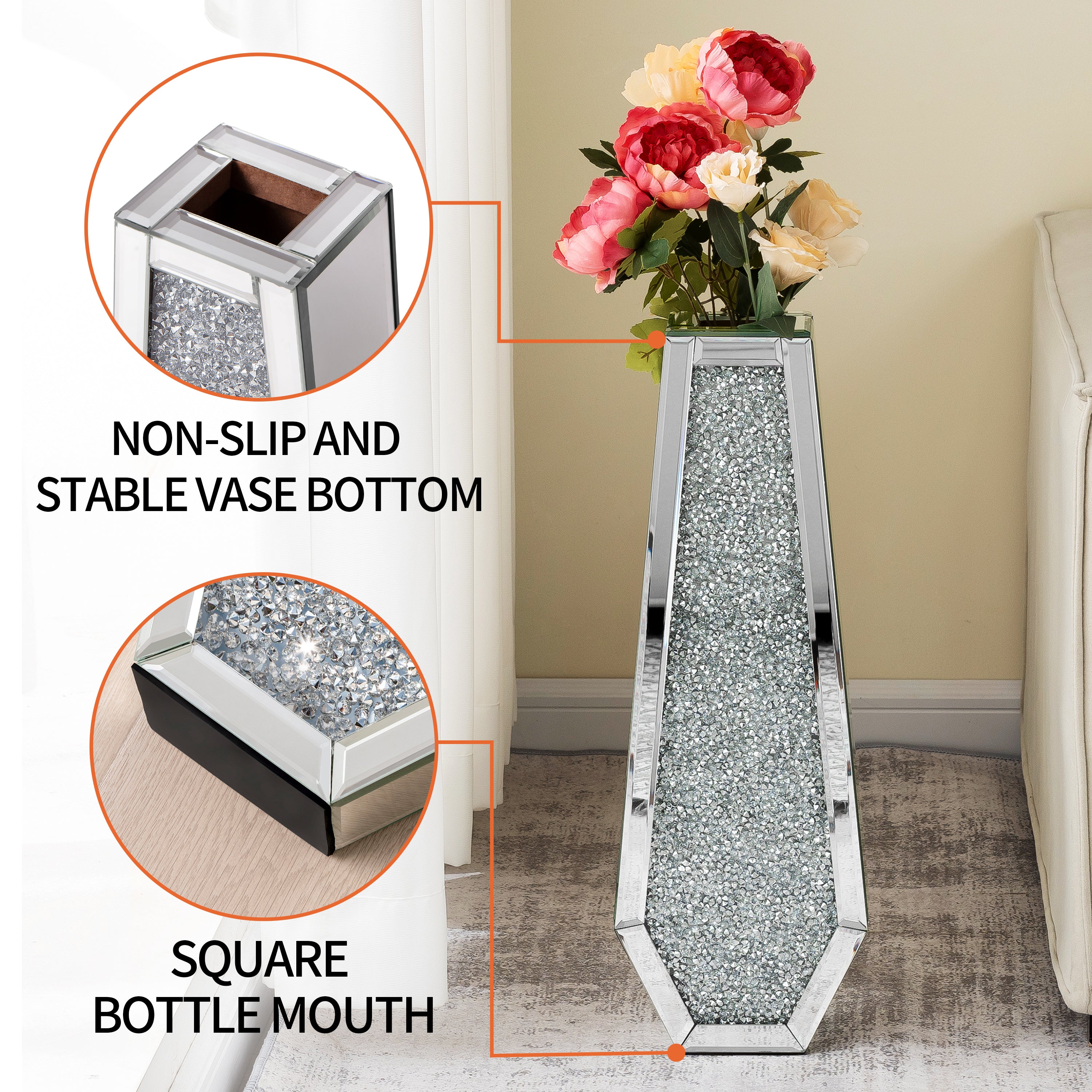 • Dazzling mirror detail: The mirrored exterior is a testament to our dedication to detail. Hand-applied crushed diamond accents catch and reflect light, adding a dazzling sparkle to your space and creating an ambiance of pure elegance.