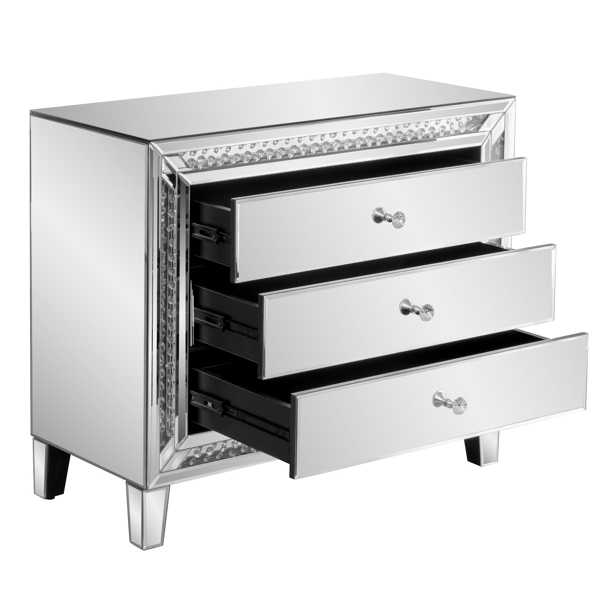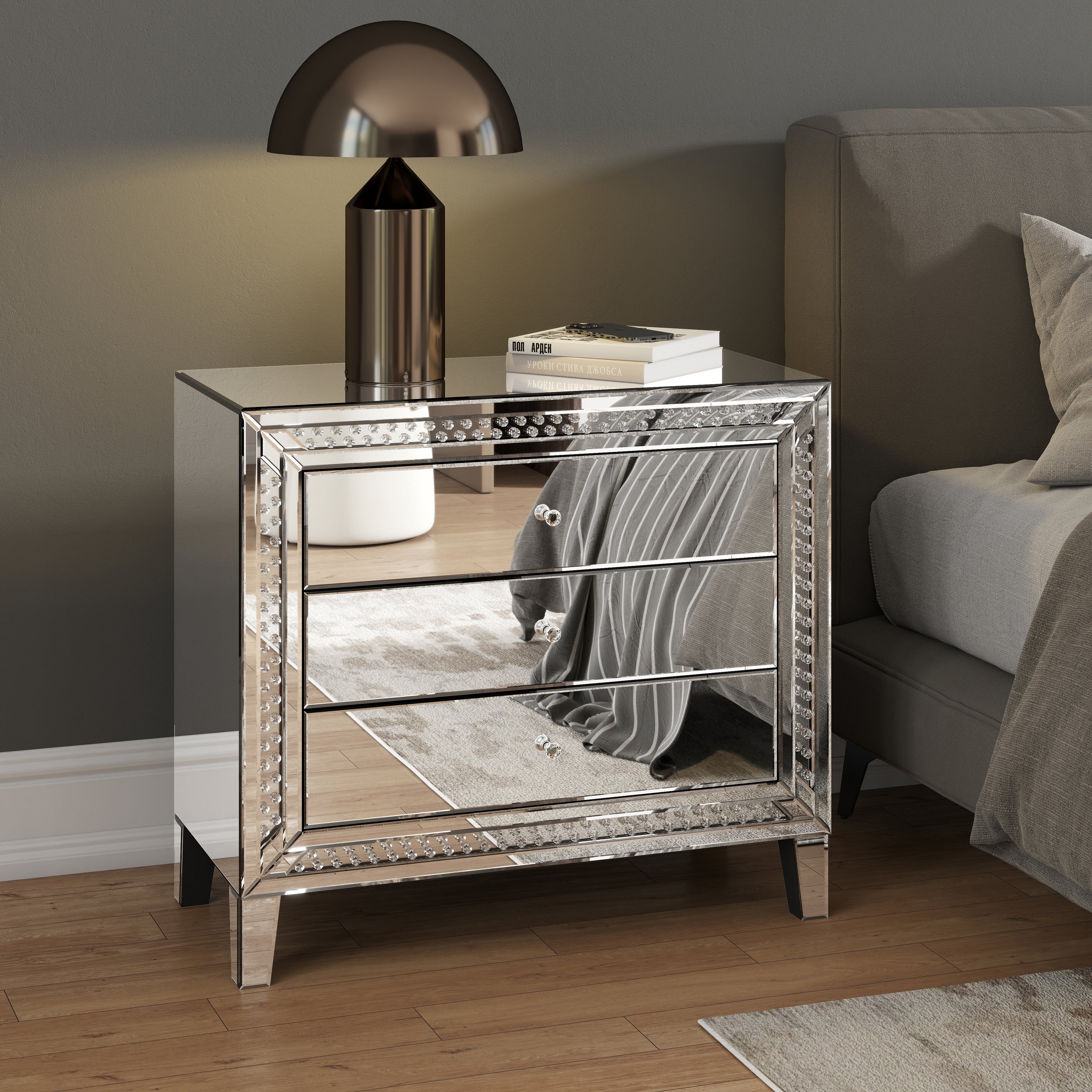 Upgrade your bedroom with this stunning mirrored nightstand, designed to bring elegance and functionality to your space. Crafted from high-quality MDF with a glass surface, this bedside table is both durable and easy to clean. The three spacious drawers provide ample storage, while the crystal knobs add a touch of luxury. Surrounding the clear glass top is a ring of octagonal crystal inlays, reflecting light beautifully for a glamorous effect. The silver finish complements any modern or contemporary decor, making this nightstand a perfect addition to your bedroom, living room, or guest room. Stability is ensured with four sturdy legs, each equipped with non-slip pads to prevent wobbling. Elevate your home with this sophisticated mirrored bedside table today!Features