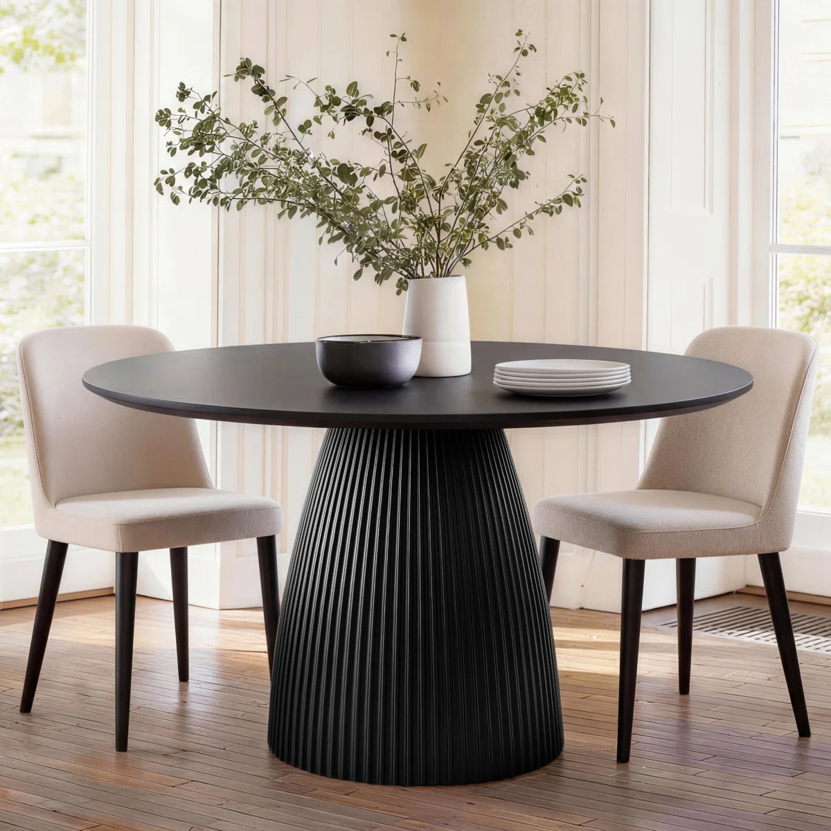 Gather your favorite people around this exquisitely crafted round dining table, where every meal becomes a special occasion. Designed to be the heart of your home, its generous round tabletop invites conversation, connection, and lasting memories—perfect for lively dinners or cozy family nights. Built from solid wood with a focus on enduring quality, this table combines timeless strength with elegant sophistication. The sturdy, fluted base offers unwavering stability, while the smooth, warm-toned finish highlights the natural richness of the grain, making it a stunning focal point in any dining space.