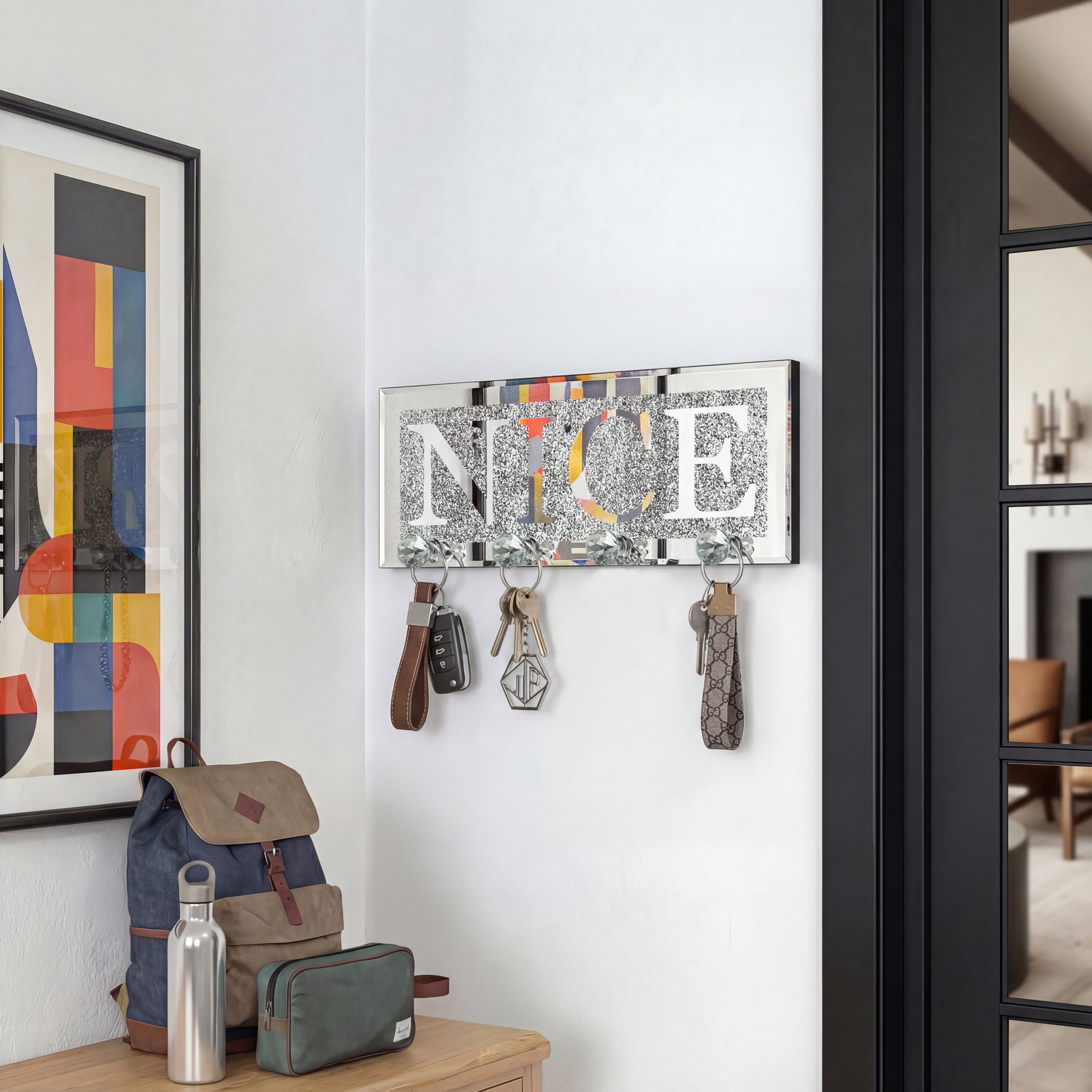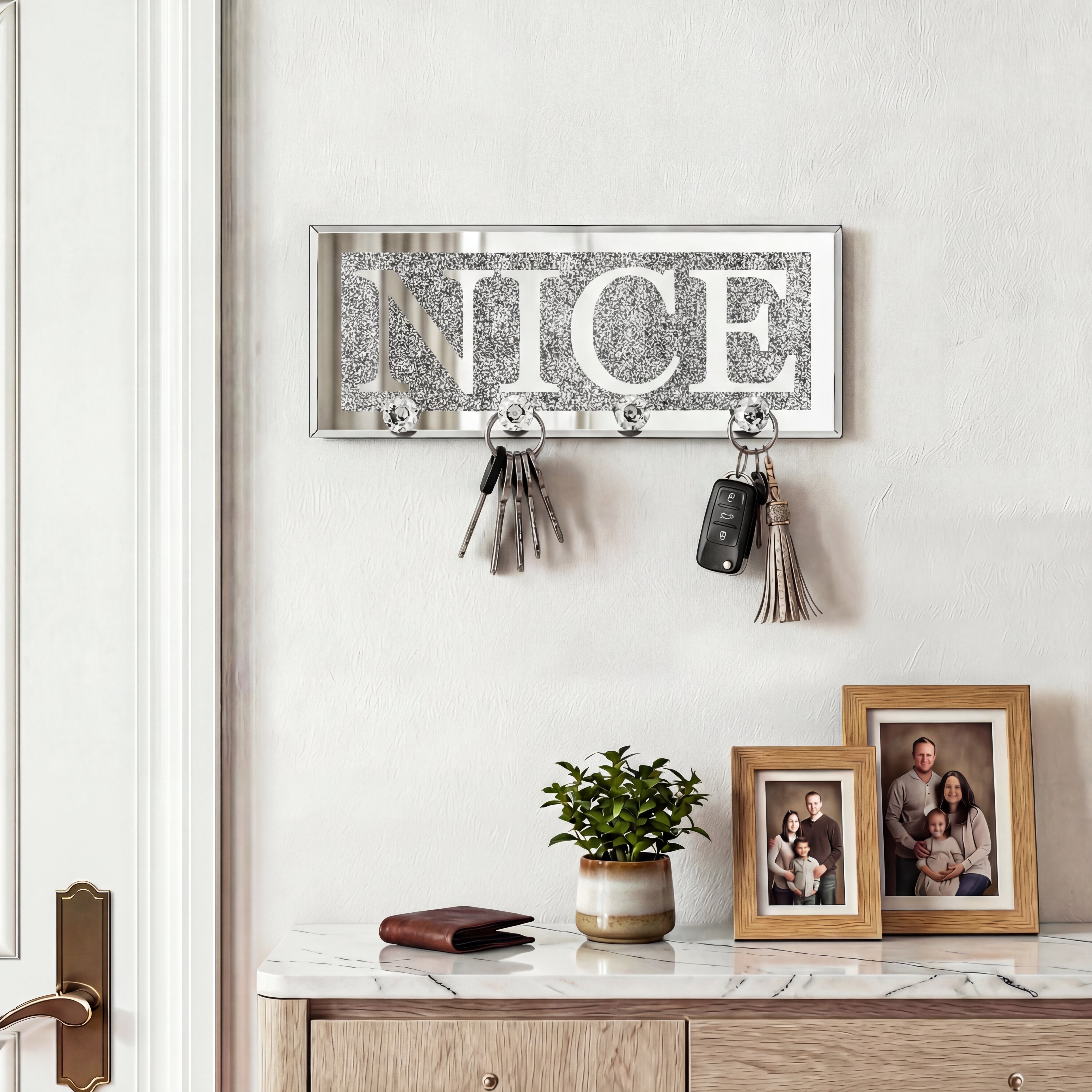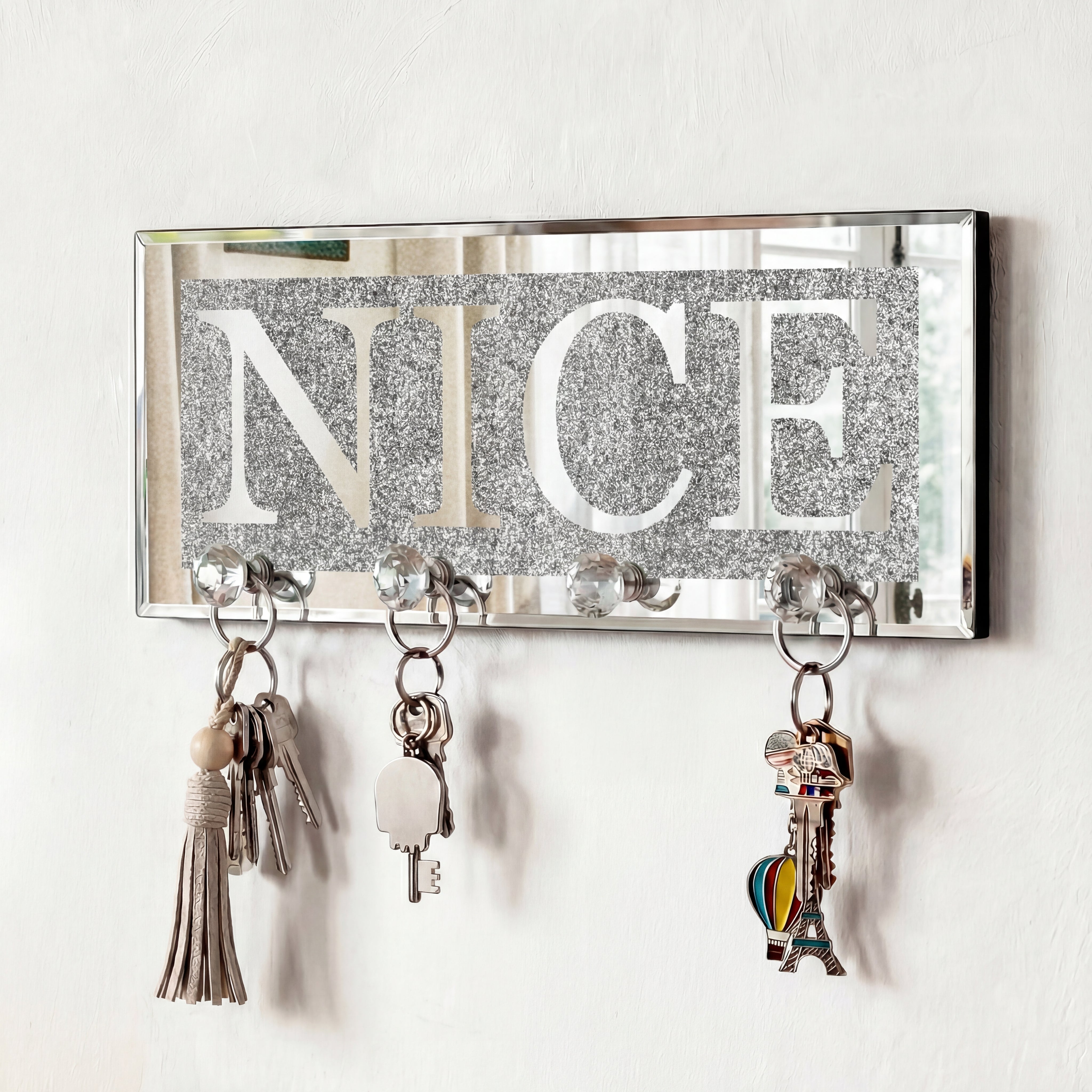 • 【Glamorous Mirror & Sparkle Design】Elevate your wall decor with this exquisite mirrored key holder, showcasing a luxurious beveled silver mirror surface that reflects light and enhances space. The iconic "NICE" letter is meticulously outlined with shimmering glitter, creating a captivating focal point that blends Art Deco elegance with contemporary sparkle. Ideal for modern, glam, or transitional interiors, this piece transforms mundane organization into a display of refined style, making it a conversation-starting addition to any room in your home.
