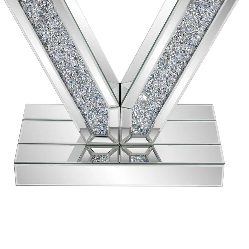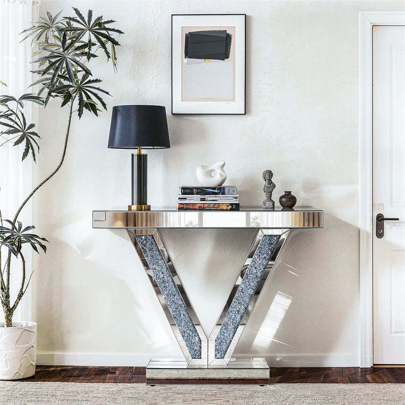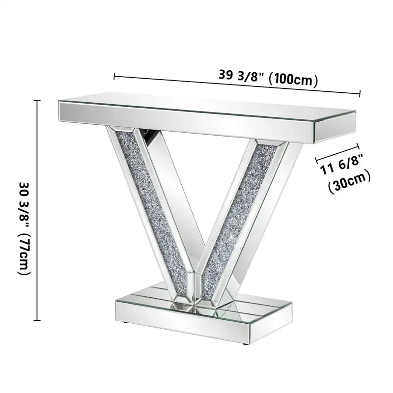 Upgrade your entryway/living space with this 39.37" V-Shaped Mirrored Console Table: sleek mirrored surfaces amplify light & open rooms, while crystal-accented V-legs add luxe sparkle. Sturdy yet glamorous, it’s ideal for styling decor/stowing essentials—blending modern sophistication perfectly, perfect for elevating small-to-medium spaces.