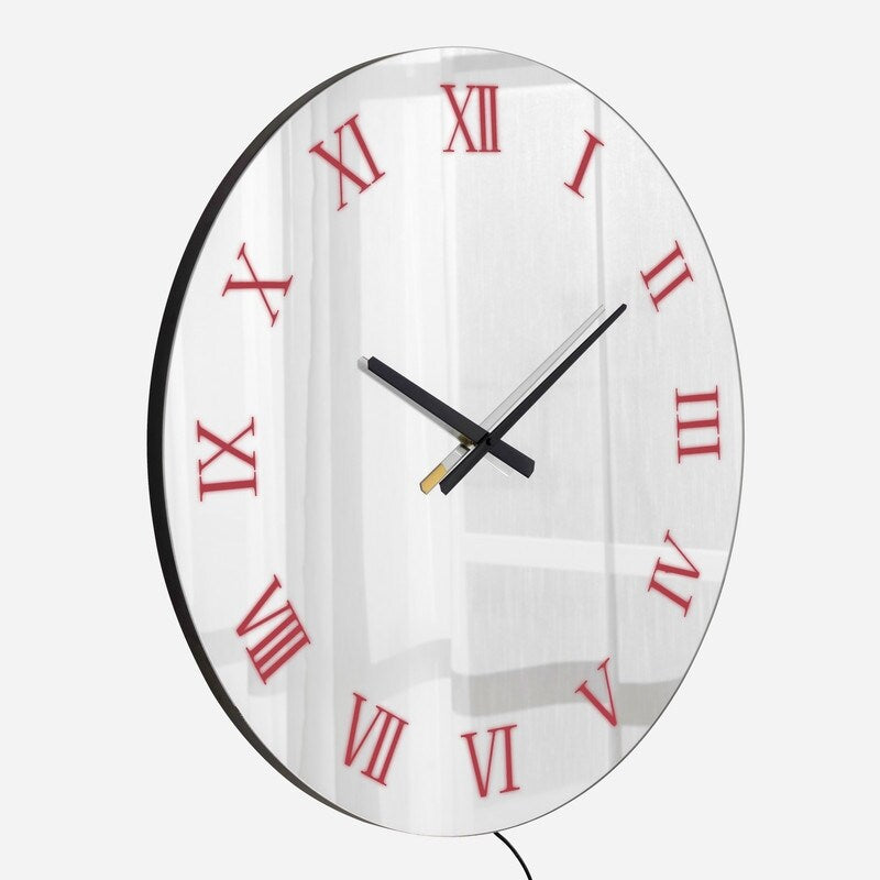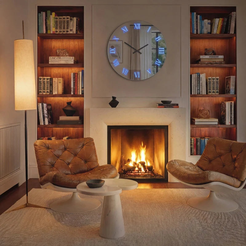 - Mirror Surface + LED Ambient Glow: This frameless round clock features a reflective mirror face paired with LED-backlit Roman numerals. The mirror adds subtle depth to your decor, while the soft, glowing backlight creates a warm, mood-enhancing ambiance perfect for modern, atmosphere-driven spaces.