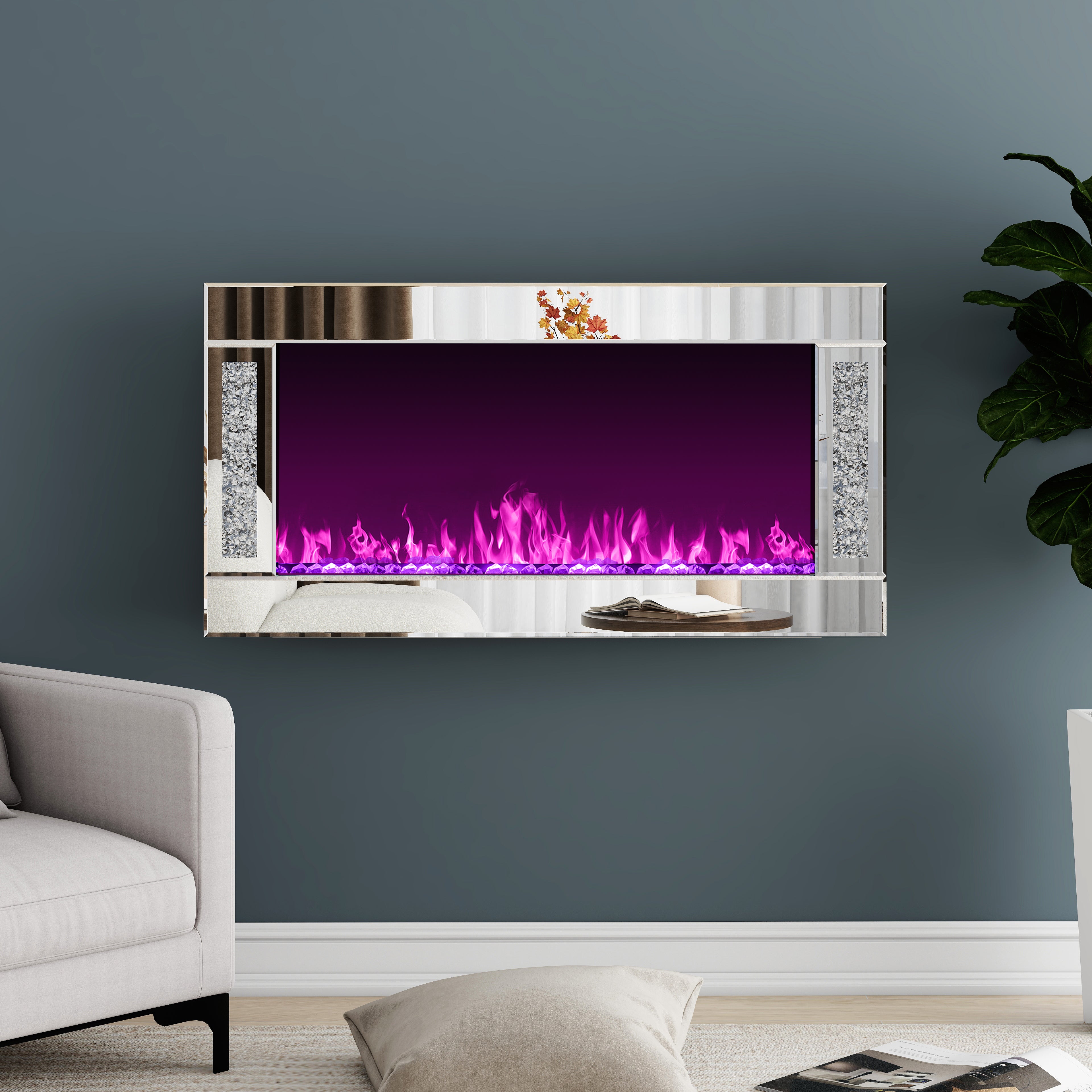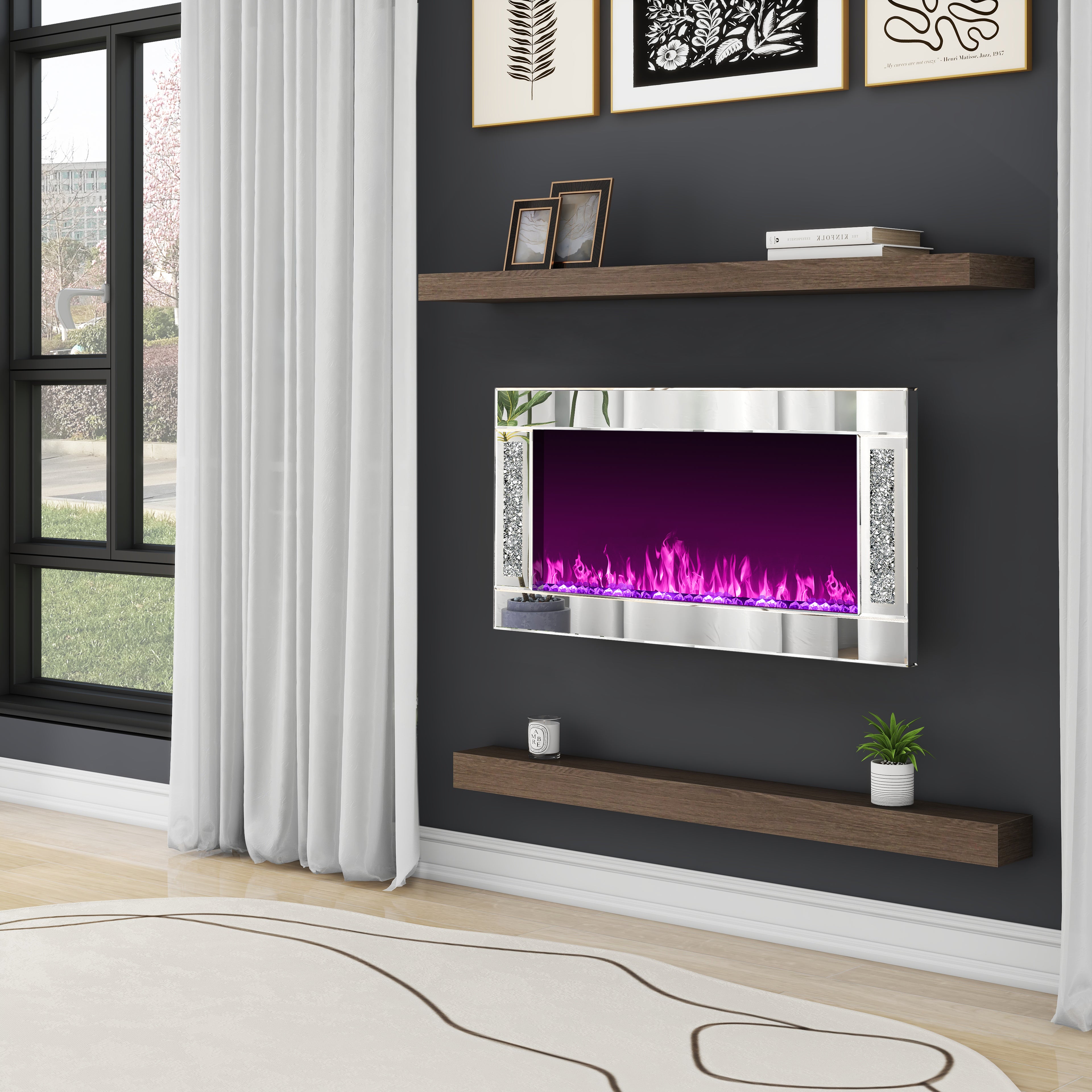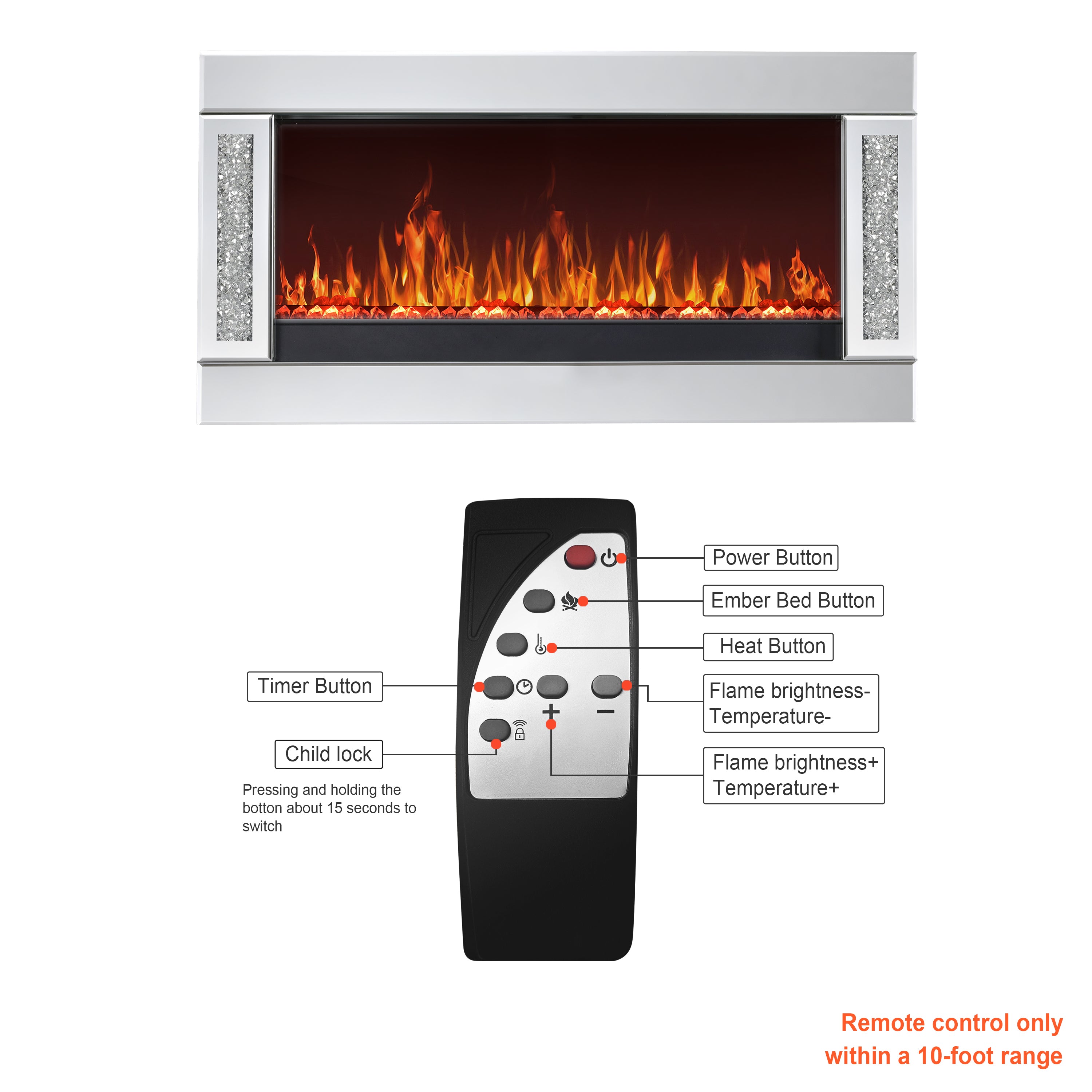 Elevate your living space with the luxurious shimmer of the Modern Mirrored Electric Fireplace. This stunning wall-mounted fireplace is a captivating blend of style and functionality, adding glamour and warmth to any room. Crafted with a mirrored design and adorned with sparkling rhinestones on both sides, this fireplace is a striking decorative piece. The heavy-duty MDF frame provides durability, while the metal core ensures reliable heating performance.