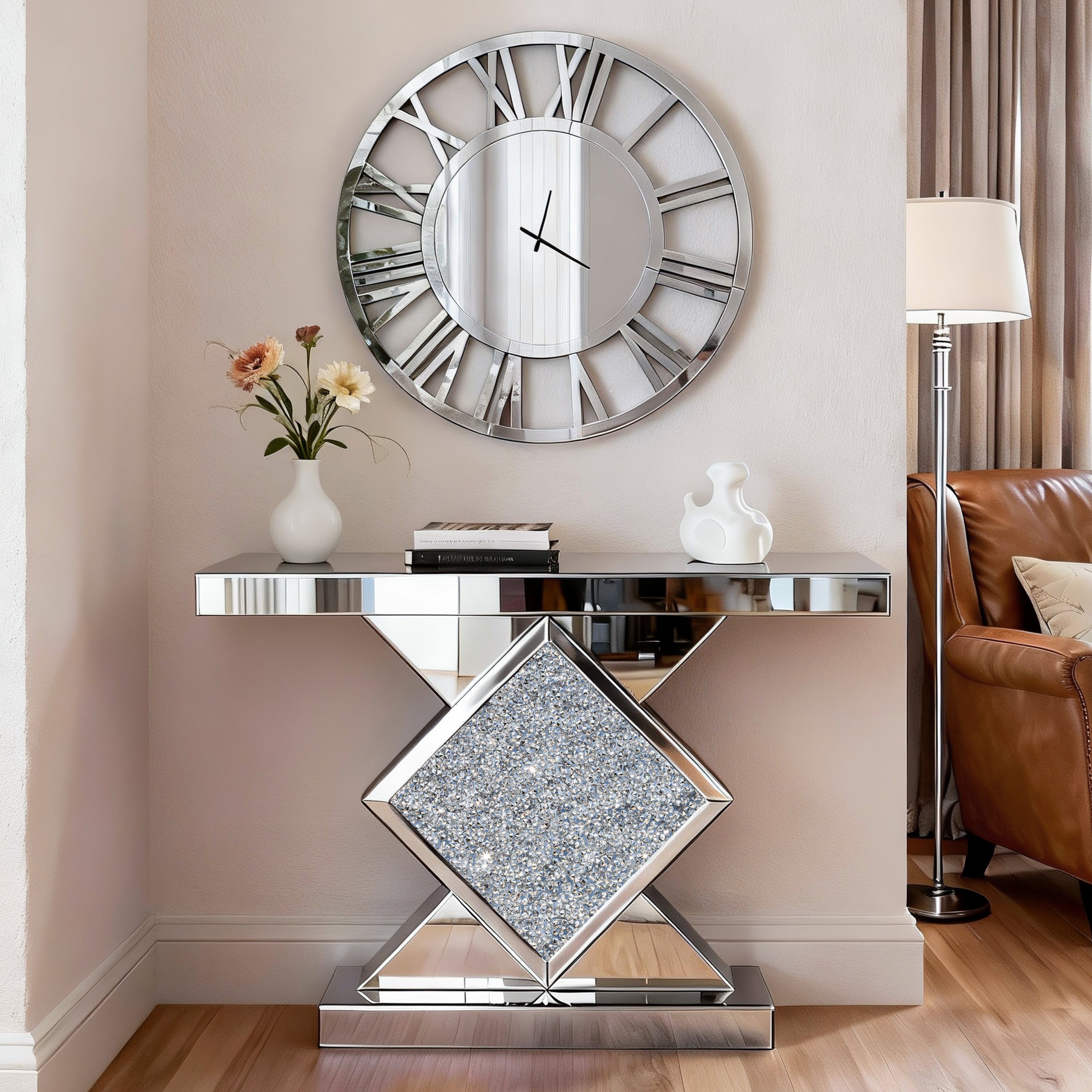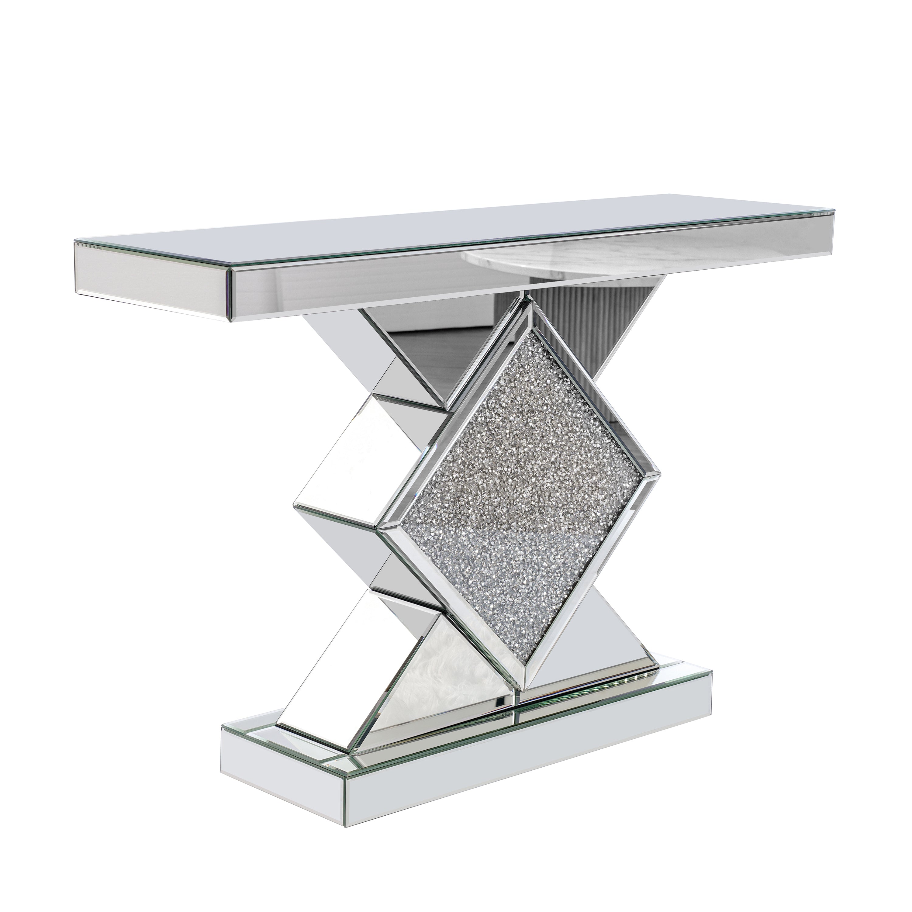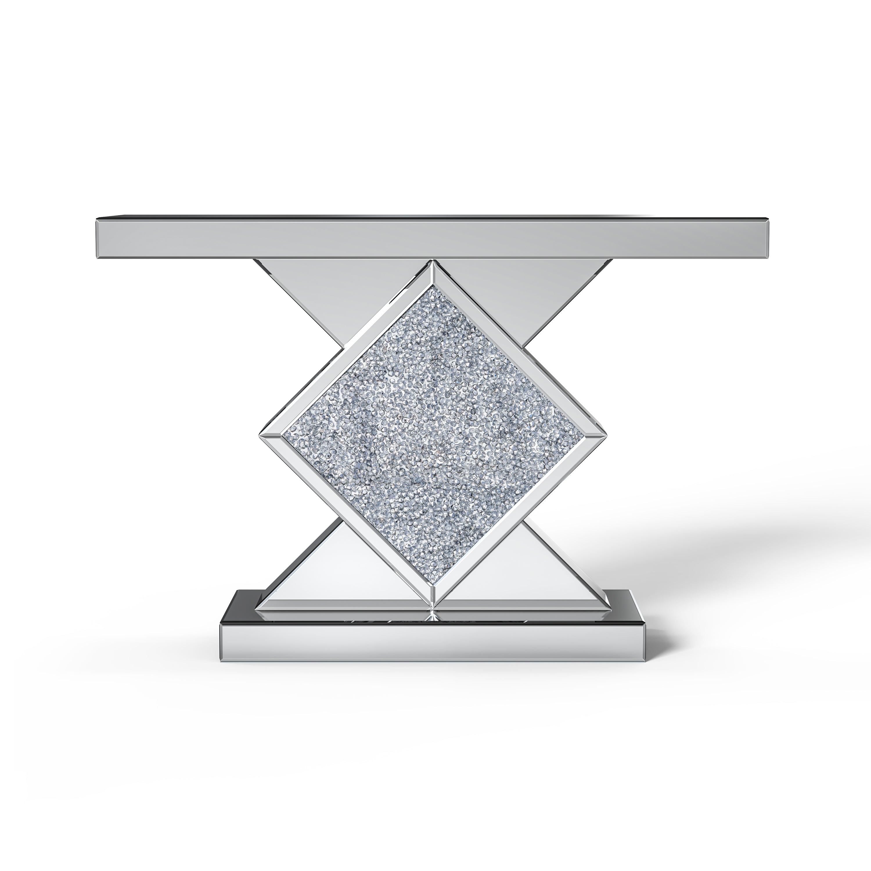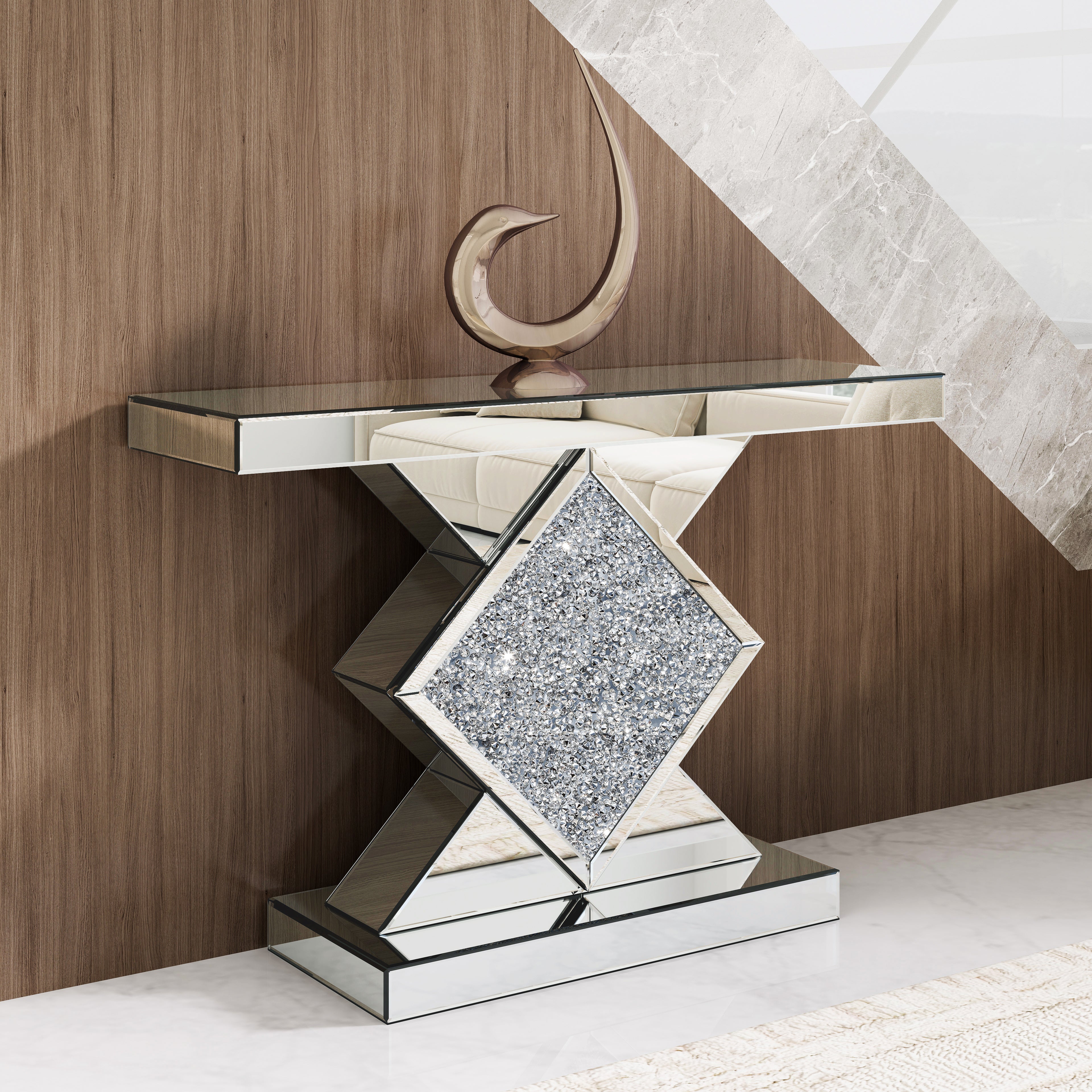 Elegant and sophisticated, this modern console table will bring a new twist to any space. This rectangular table is perfect for your living room or entryway, place it behind your sofa and let the light bounce around your room, or place it in your entryway right next to the front door. This entry console is made of an engineered wood frame and it has a full mirror finish. Its tabletop is an ideal platform for table lamps, flower arrangements and a collection of framed photographs. The mirrored shiny diamond design and pedestal make this striking console a statement piece in its own right. Make a statement with this multi-functional, modern console accent table.
