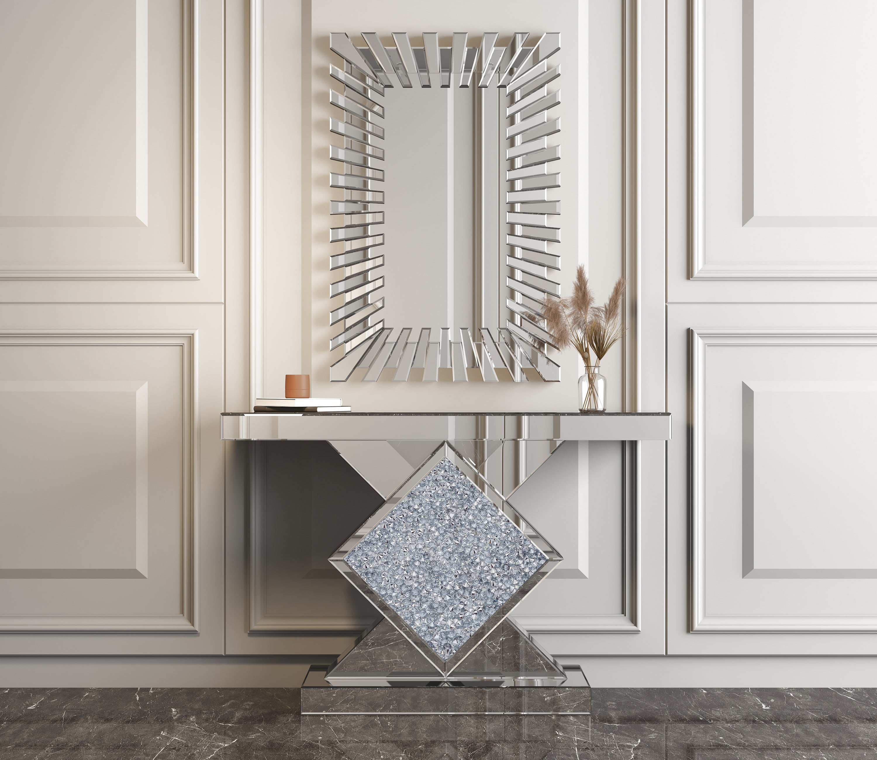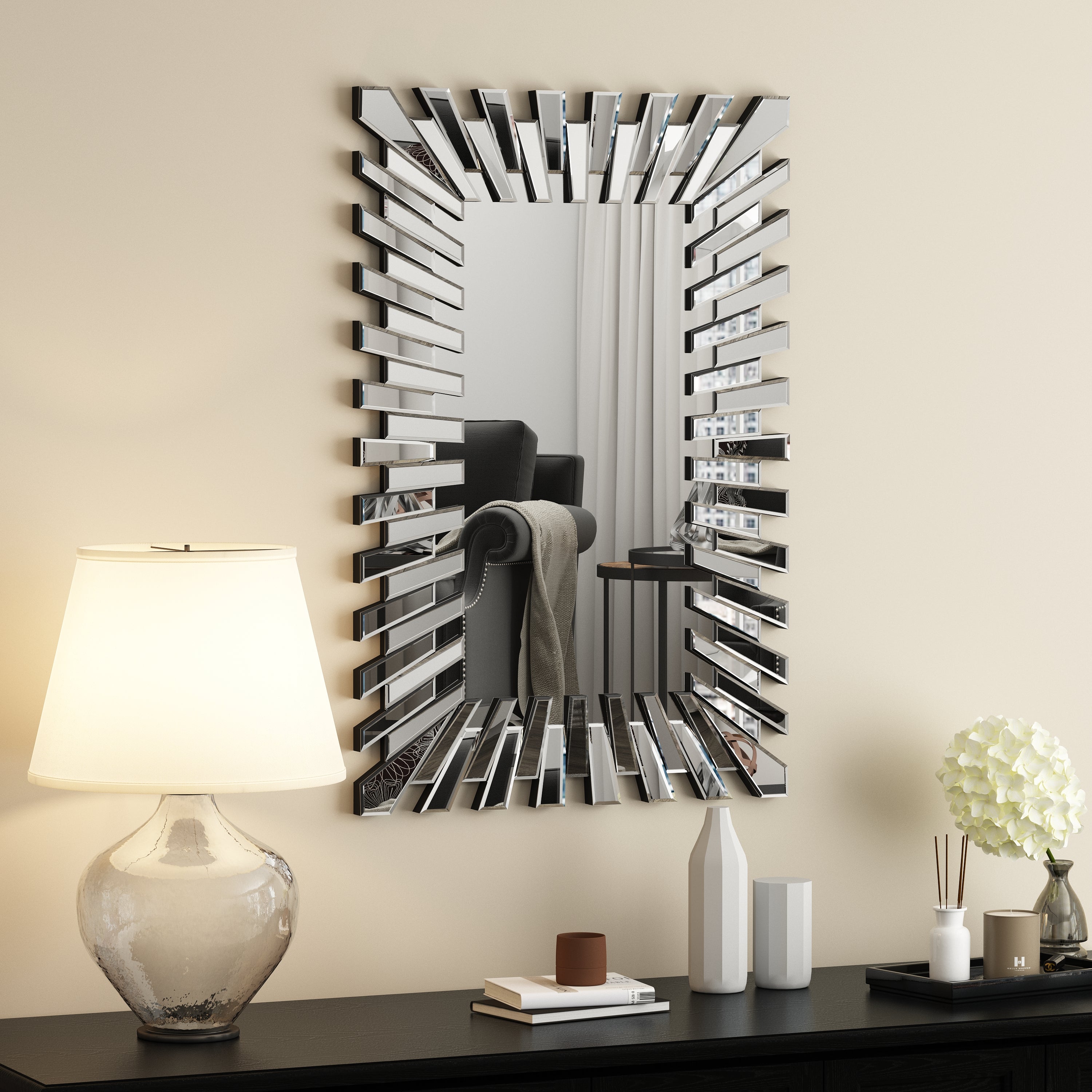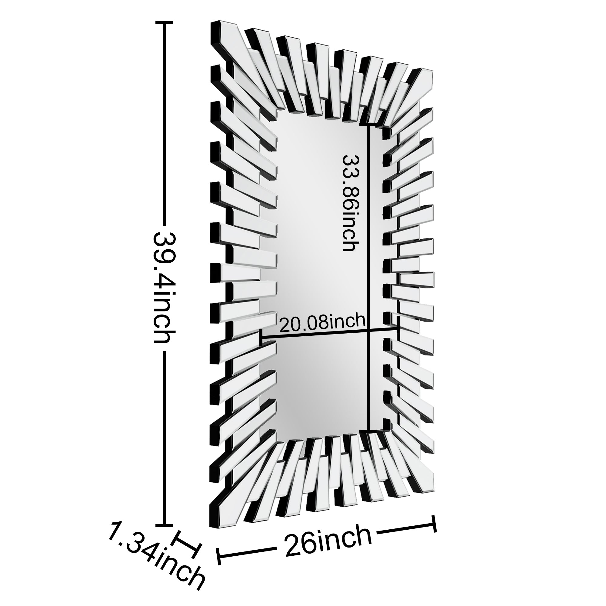 • Unique Design】This captivating accent mirror features a starburst 3D frame surrounded by interlaced rectangular glass, making it a standout decor item suitable for any home, room, hotel, or business space due to its distinctive and sensational style.