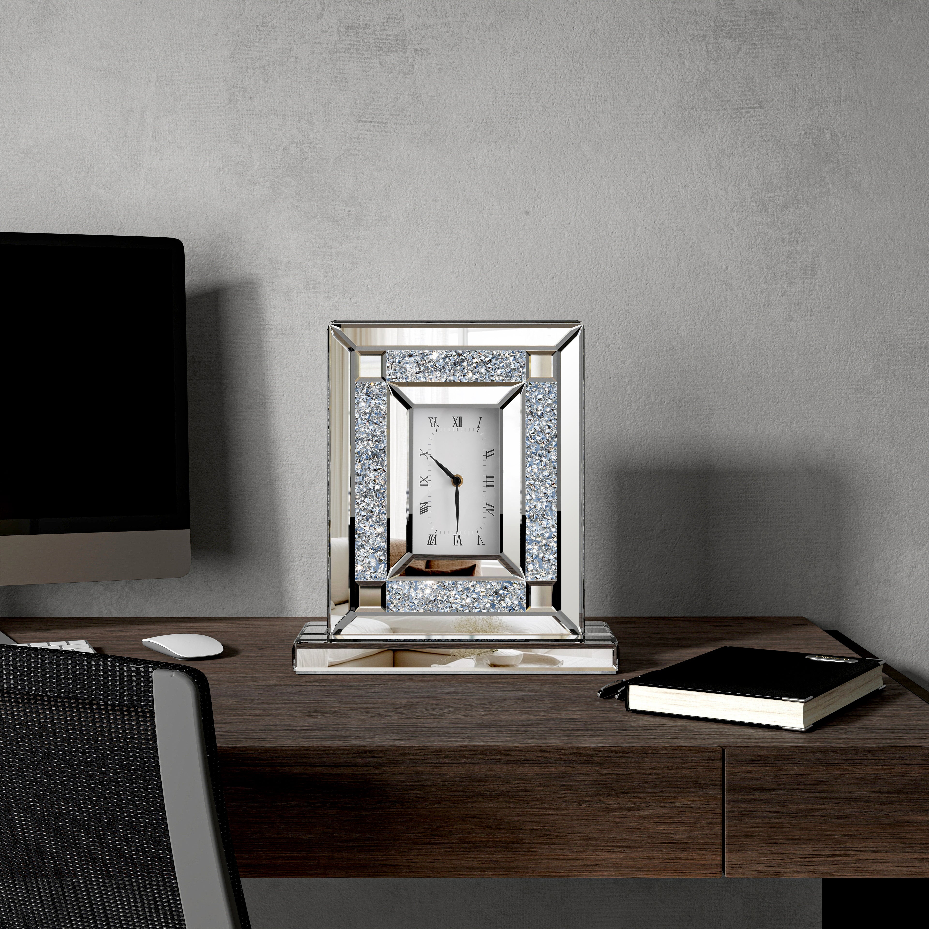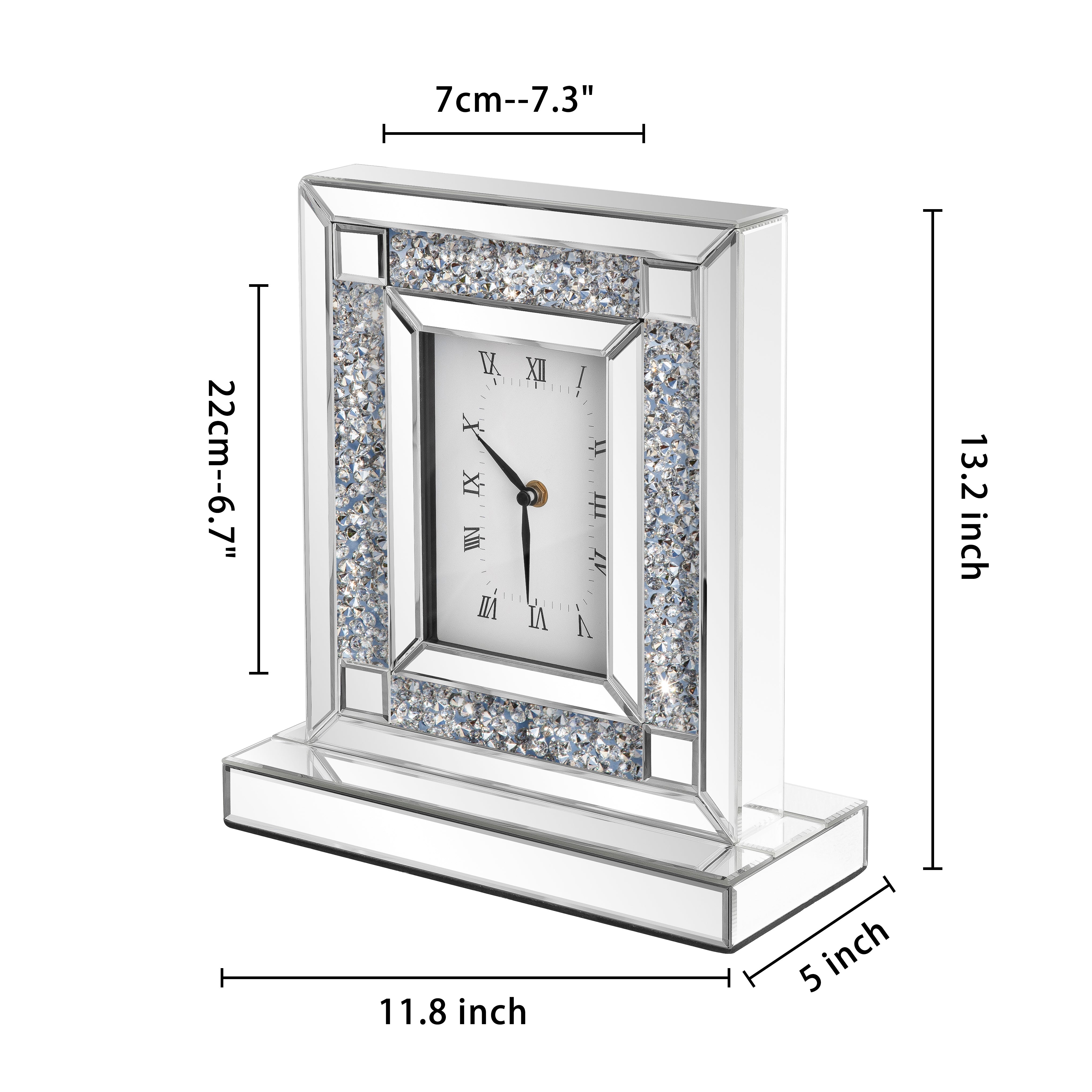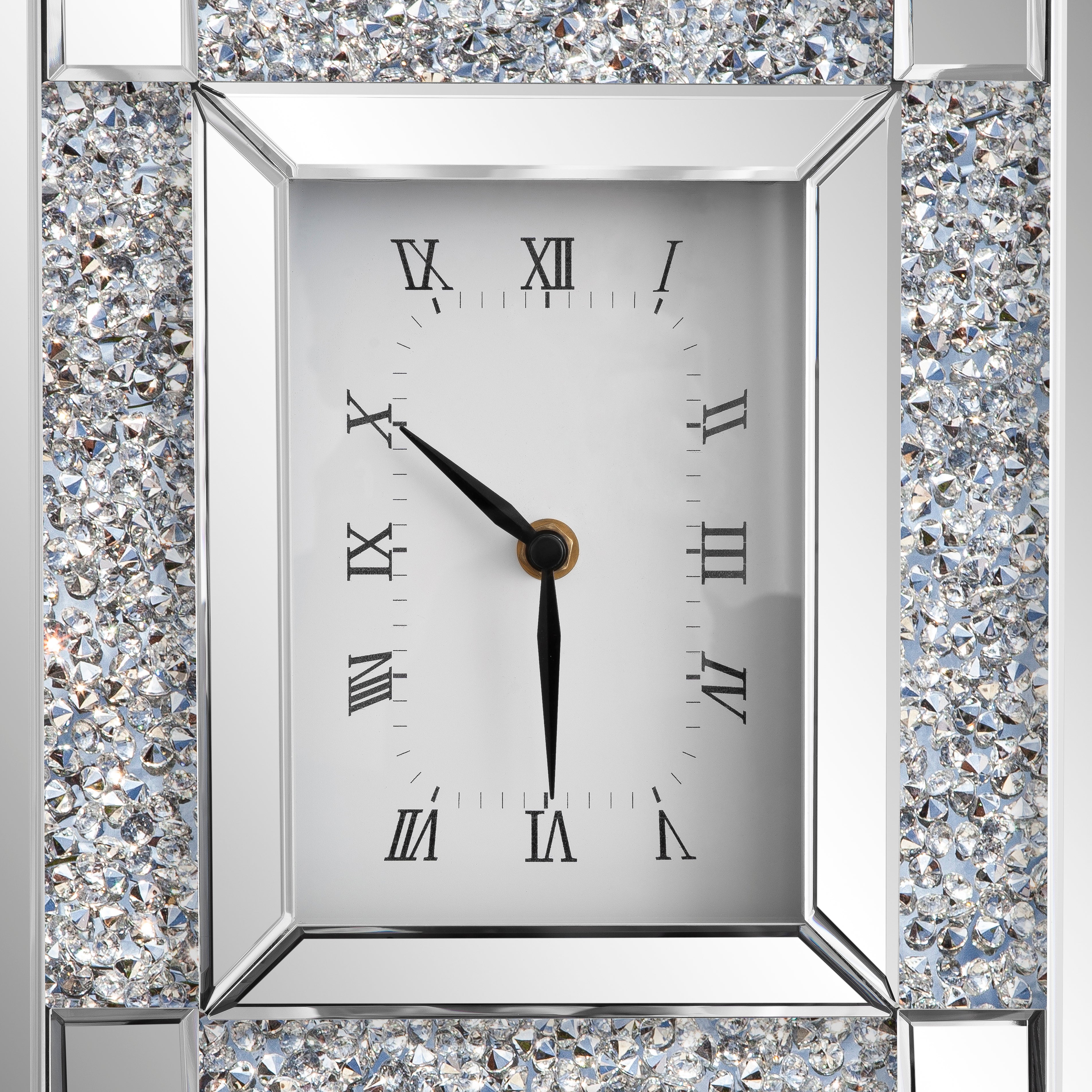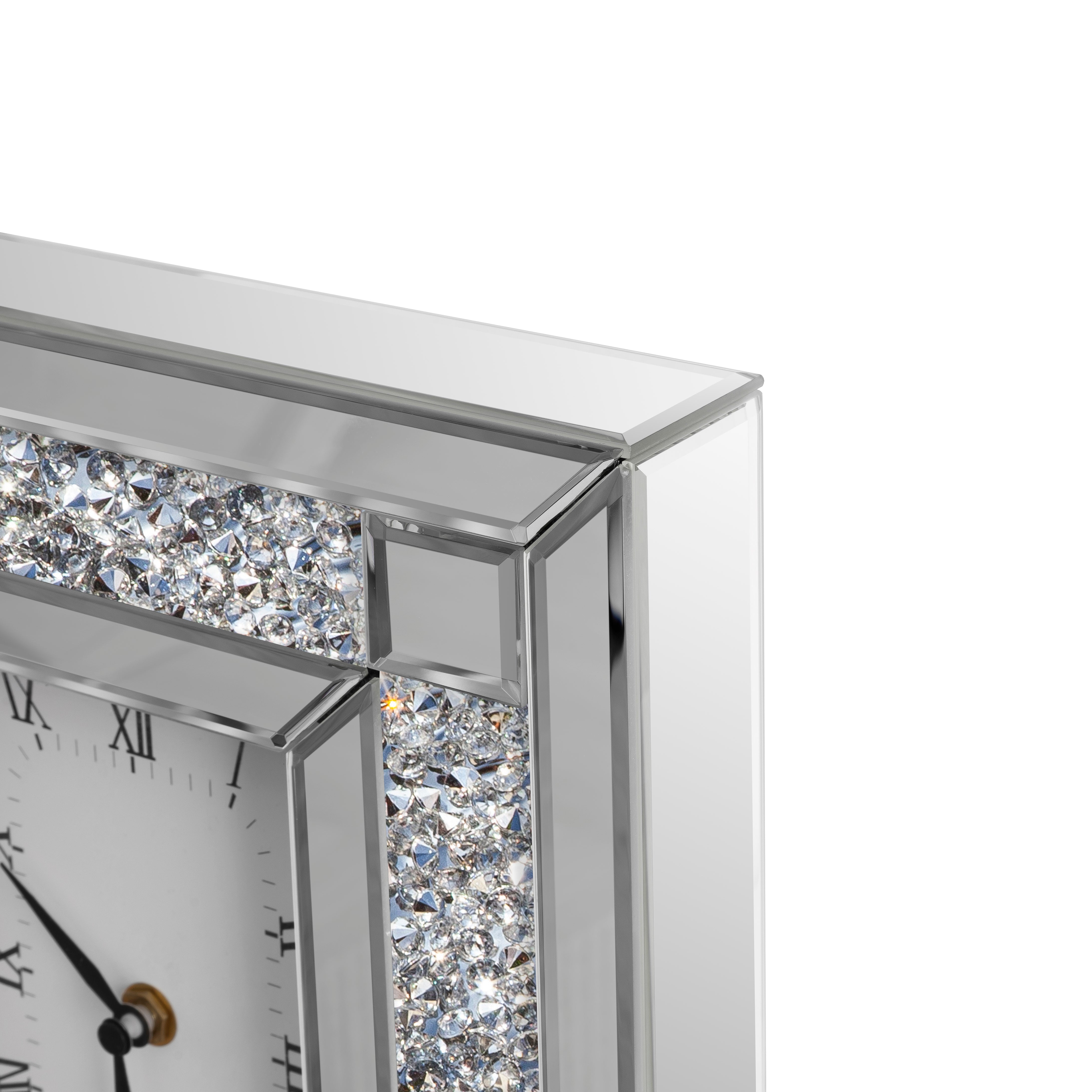 Elevate your home with this glamorous mirrored table clock. Dazzling crushed diamond accents add sparkle, while the beveled glass and Roman numerals create a sophisticated look. Crafted with a durable MDF back and featuring precise quartz movement for accurate timekeeping. Available with silver or black crushed diamonds. Perfect for your living room, bedroom, or mantel.