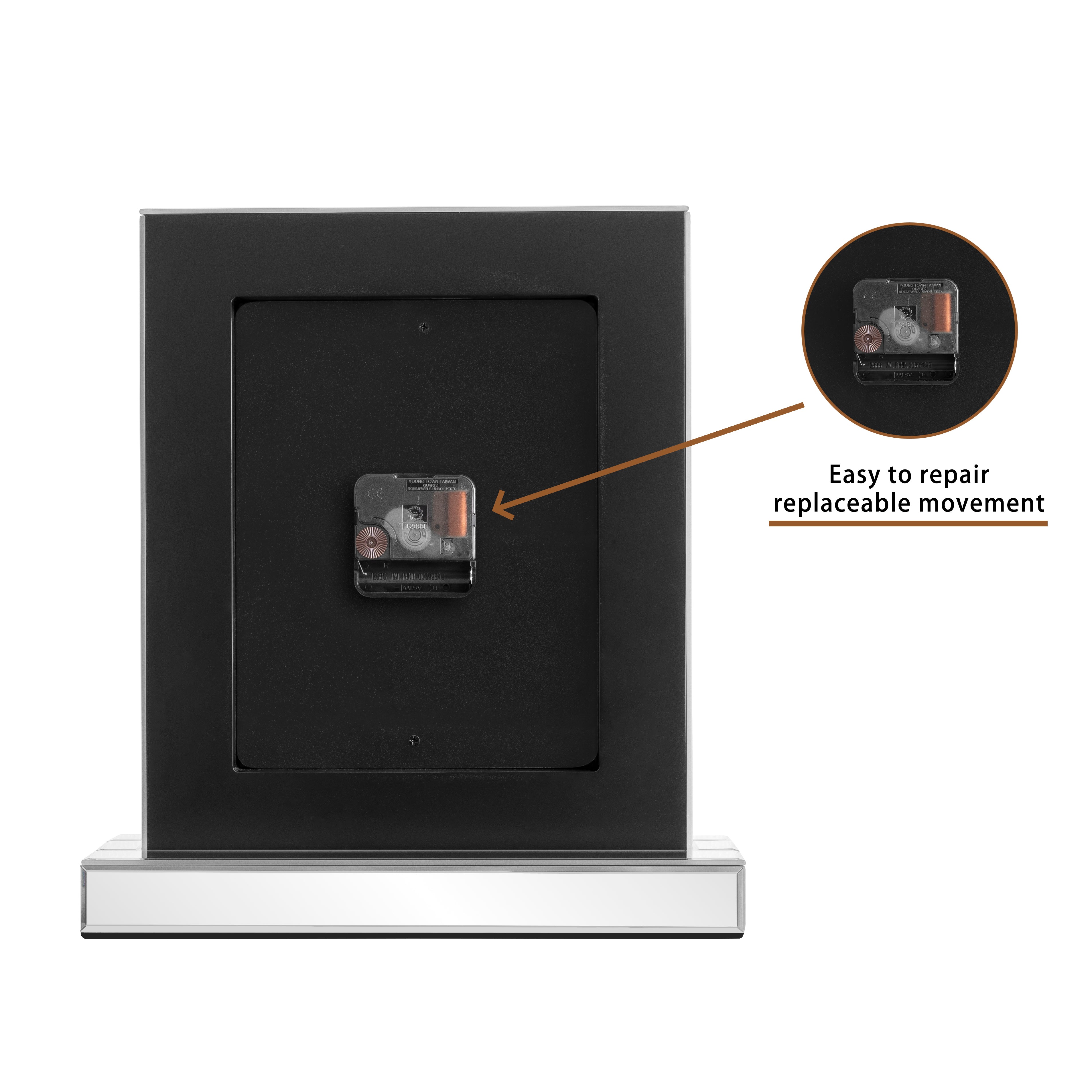 Details:Elevate your home with this glamorous mirrored table clock. Dazzling crushed diamond accents add sparkle, while the beveled glass and Roman numerals create a sophisticated look. Crafted with a durable MDF back and featuring precise quartz movement for accurate timekeeping. Available with silver or black crushed diamonds. Perfect for your living room, bedroom, or mantel.